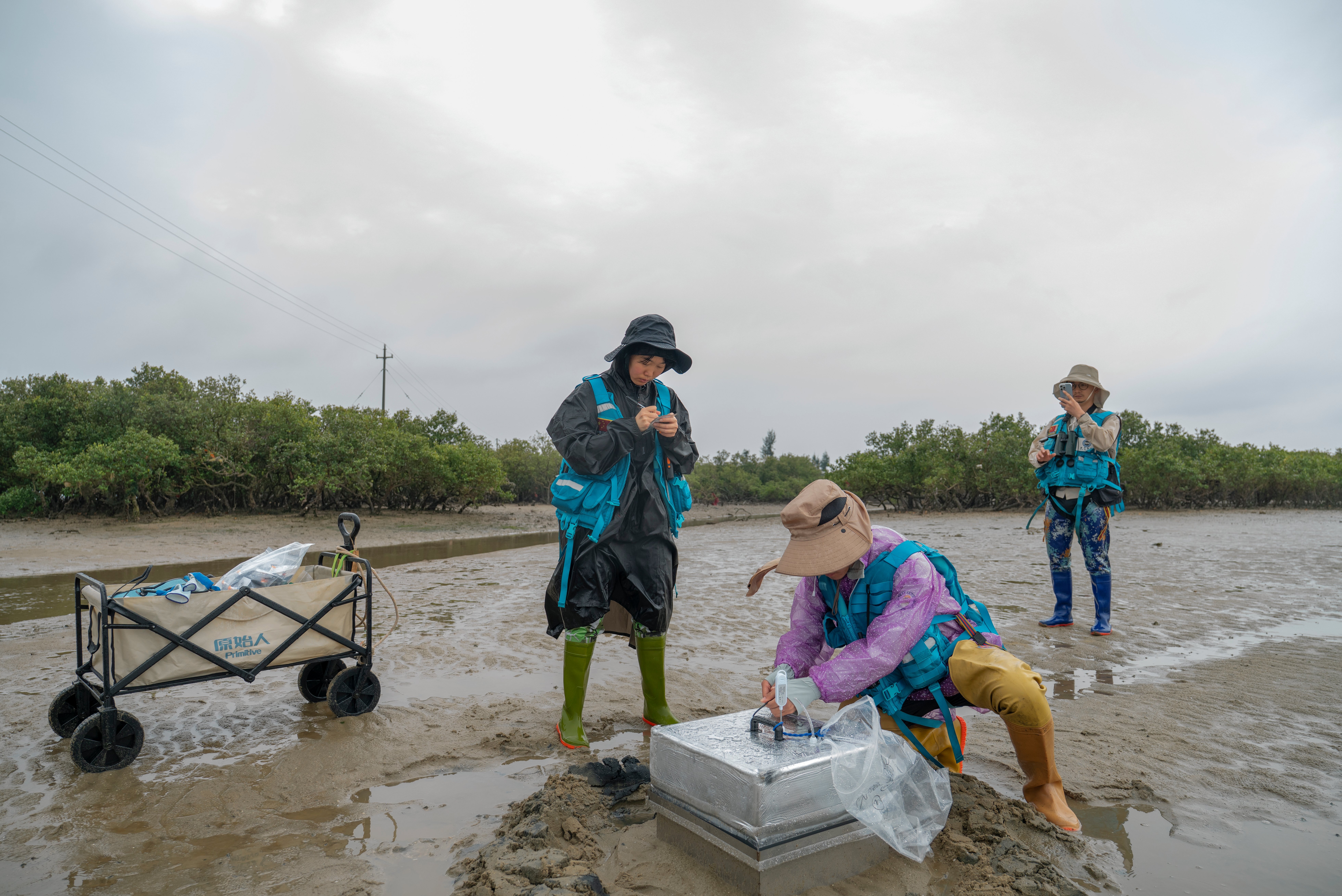 Ook de leden van het onderzoeksteam zijn goed herkenbaar aan hun blauwe zwemvesten en hoge lieslaarzen. Het is een diverse groep, zowel qua leeftijd als achtergrond, met naast vogelaars ook een aantal studenten van Peng, twee voormalige bouwvakkers en een afgestudeerd dierenarts. Peng zelf, energiek en schijnbaar onvermoeibaar, houdt het overzicht en lost problemen op. Als een van de teams na een trektocht over het wad een thermometer blijkt te zijn vergeten, springt hij op een motortaxi om er een op te halen.
